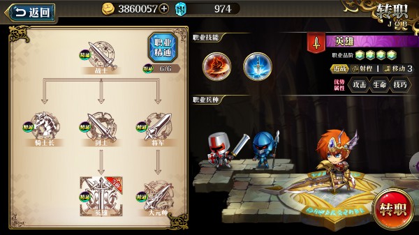 每次转职可以解锁1-2个技能,2个兵种。不同的职业路线也会改变英雄的职业类型,进而影响英雄在战斗中的克制关系。