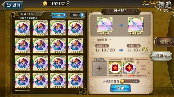 当装备强化到满级时,可以通过装备突破提升装备的星级和等级上限。