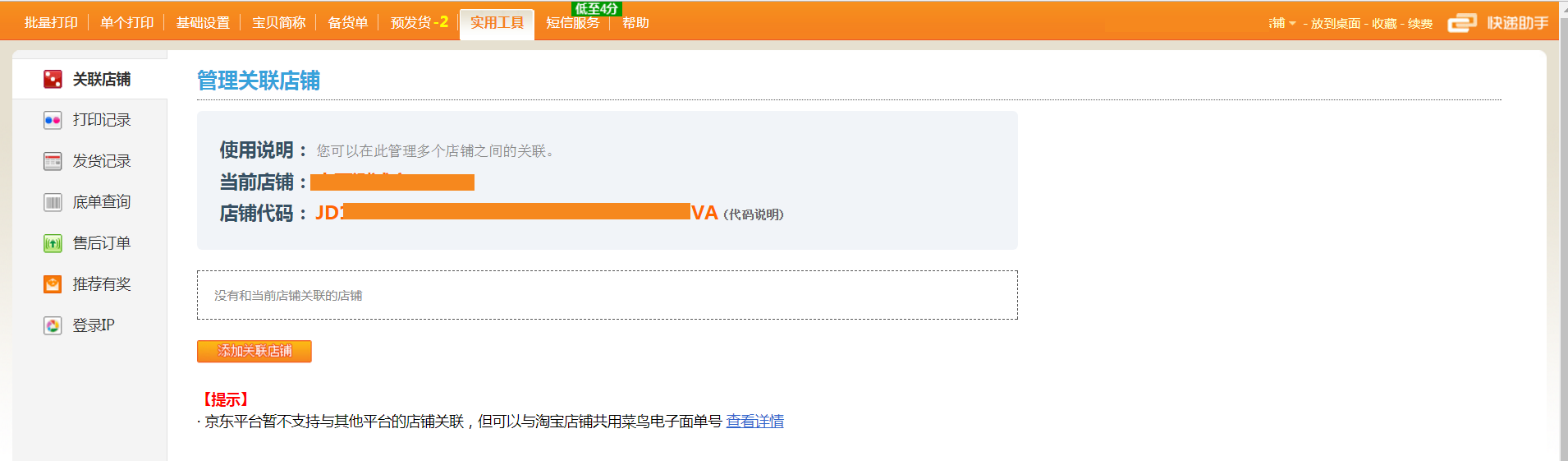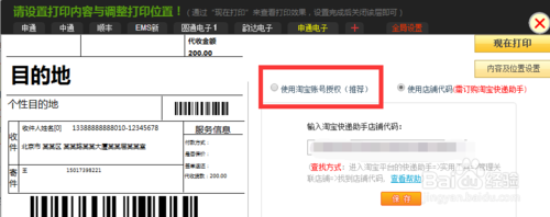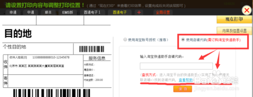8、店铺代码授权:此类授权方法需要您有订购淘宝平台的快递助手。