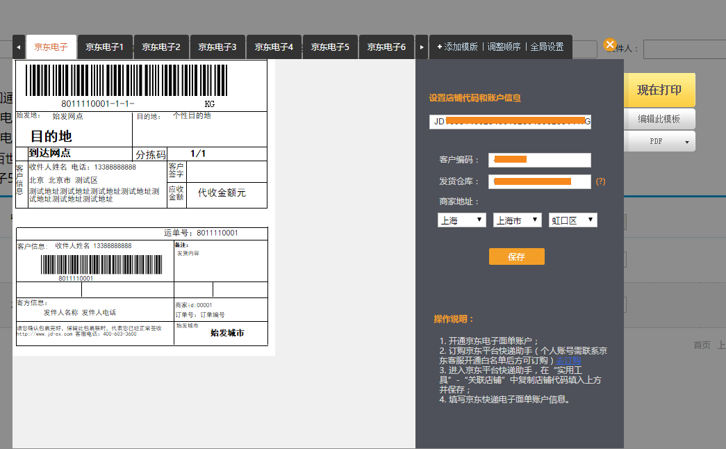 ①在自助版,“快递单设置”-“添加模板”-“添加快递公司”-“快递公司”-选择“京东快递”-保存。(获取京东授权token)。