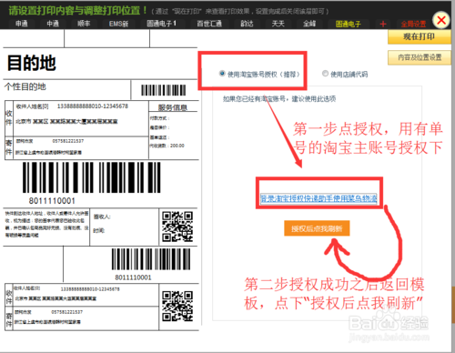 7、模板上有2种授权方式,推荐您使用淘宝账号授权的方法。点下模板上面的蓝色字体,跳转淘宝的登录页面,需要您用有单号的淘宝主账号登陆授权下,最后返回模板点下刷新即可。