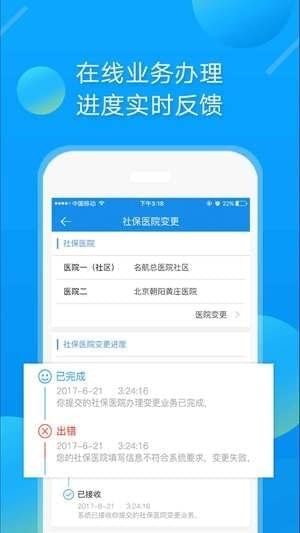 下载中智北京APP后,用户可以在线变更社保手机号及社保定点医院,并可实时查询变更进度,无需亲自到服务大厅排队等候办理。