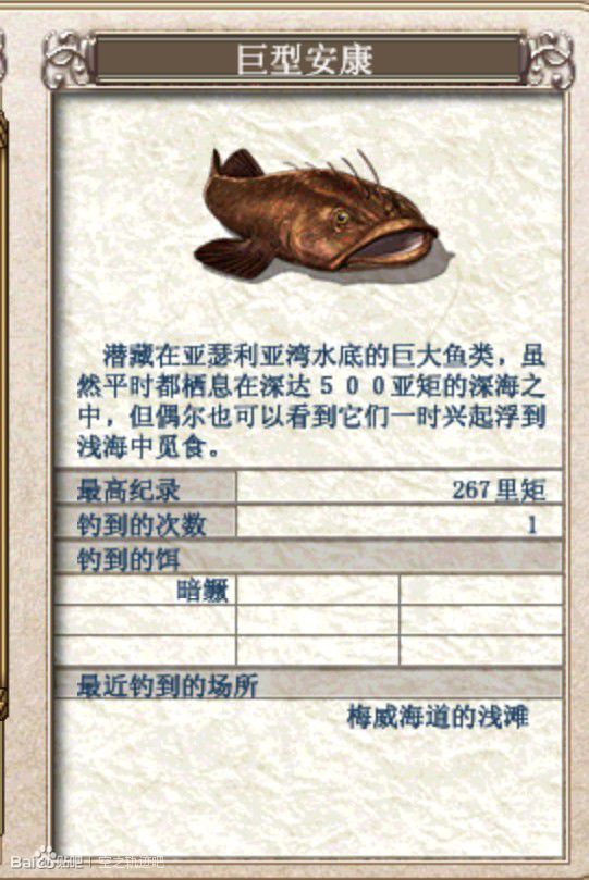可钓鱼类:太阳鱼、绿鳞鱼、狮鱼、八爪鱼、黑鲷、鲯鳅、巨型安康(浅滩)、帝剑鱼(唯有此处可钓)