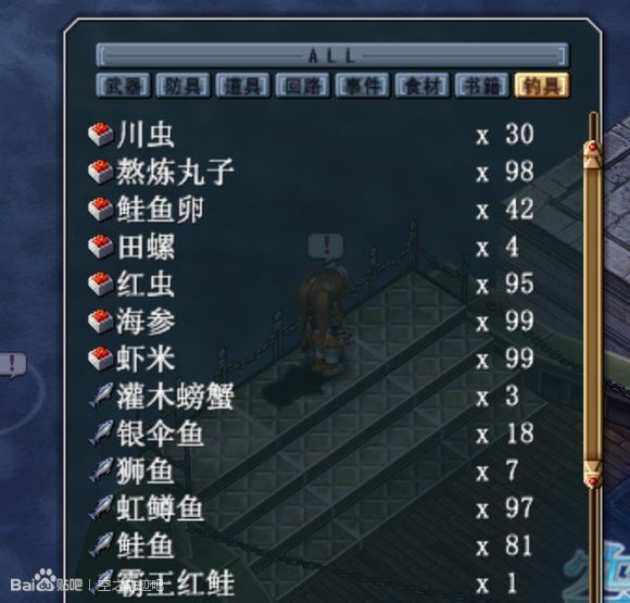 (A)钓鱼竿:第一章初期,随着主线剧情自动获得。判定补偿:无。