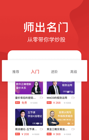 特色课程:近百名投顾组成的专家团,将众多繁杂的碎片化股市技巧形成实用的交易体系,相授于众;分为入门、进阶、高手的不同难易度的,技术分析、价值分析、量化分析的不同类别的股市课程,用户可根据对股市的认识程度来学相应的课程,以提升炒股水平。