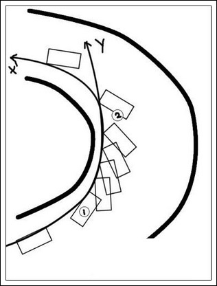 玩家进入大弯道时,首先玩家呀贴近左侧的轨道,但别除了沥青路面(沙路或多或少会减少速度,而起PC最会走沙路了,这样也是为了防止撞车),玩家先缓慢调整角度,待到出弯道的时候,车保持与X线路出去,图中标记②的地方,是小编觉得比较好的的出弯道地点(理论上时这样的)。