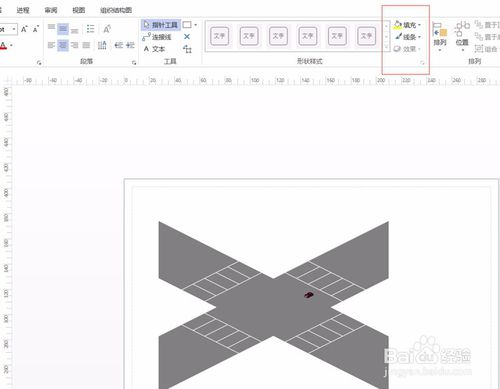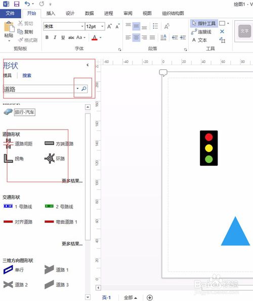 比如自己想做一个红绿灯的路口图,可以在左边【形状】搜索:道路。然后出出现很多形状,选择自己需要的。