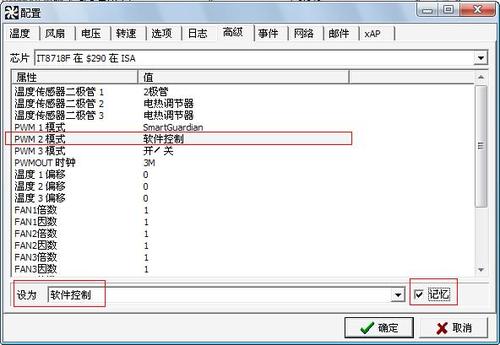 接着,选中「PWM 2 模式」选项,这个选项是指对2号风扇的控制(PWM 1、3、4、5以此类推)。我们需要在下方为其设定控制方式,这里我们要选择「软件控制」。然后[记忆]。 这样我们就可以回到主画面去调整风扇转速了。需要注意的是,有些风扇当转速低于一定程度X%时,风扇会停转,所以记得要关注风扇转速,以免造成损失。对于一般的风扇来说,转速0%时,风扇转速最慢。