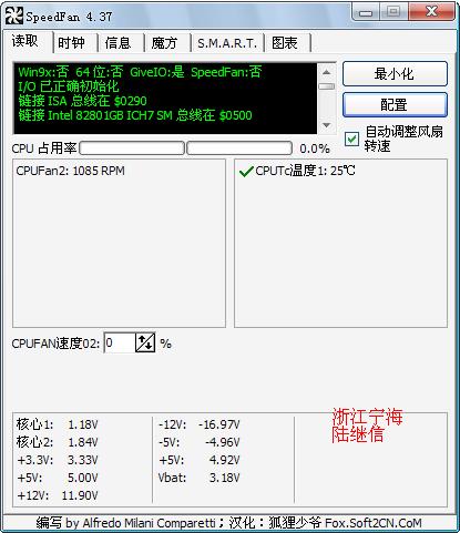 SpeedFan是一款硬件监控工具,可以魔方图显示 CPU 温度、电压与主频、占用率,硬盘温度与健康,风扇转速,电池电量,开机时间等重要系统信息。它的特色功能是可根据系统温度更改风扇转速。还具备读取硬盘温度与 SMART 信息,更改 FSB 速度(软超频/软降频),报告部分 nVidia 显卡温度、电压等特性。该软件每次更新都会对包括 CPU 和主板等大件在内的硬件新增/改进支持