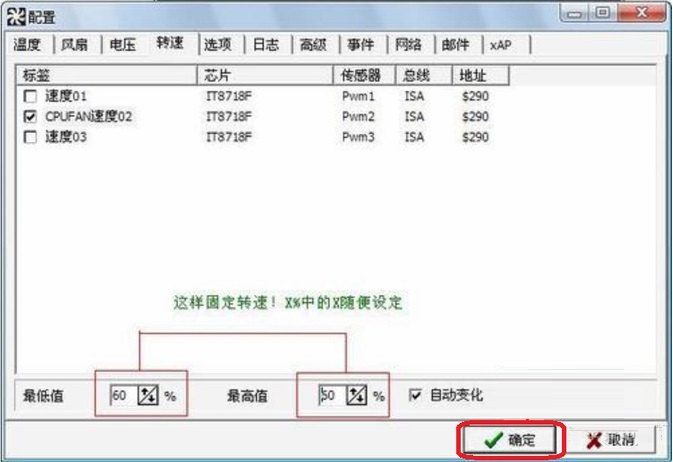 图中最下方的设定是SpeedFan的自动调整转速功能,我们启用自动变化。