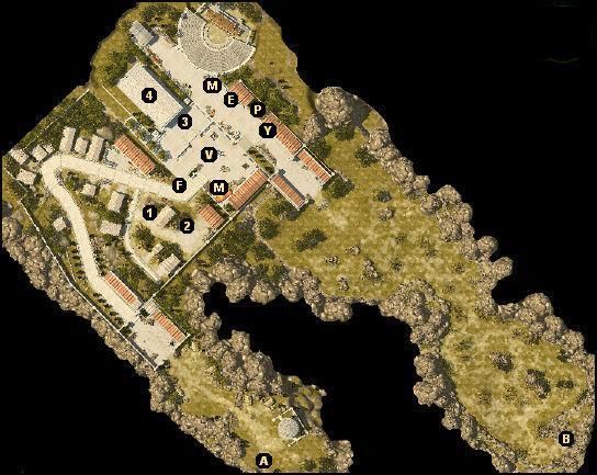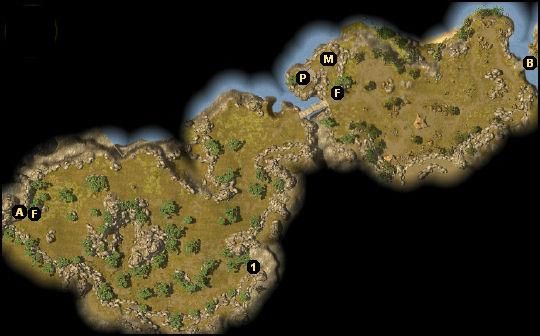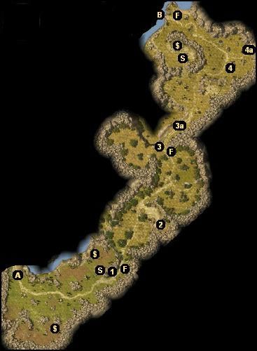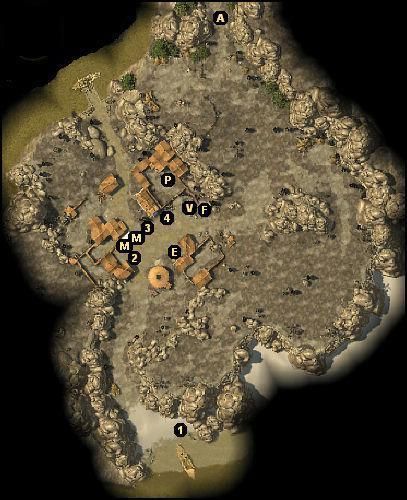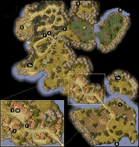狄俄米德斯(#4)是村中的长者,他会交给你游戏中的第一个主线任务 - 击败带领萨提兽人袭击村子的巫师(#4a)。萨提巫师大概是4级,遇到他时你应该是2级,这个萨提巫师比你之前遇到的怪物都要强悍,如果觉得对付他有困难,那就把升级时获得的技能点和属性点分配掉,并好好利用附近的两个神坛。萨提巫师死后会掉一些物品和装备。
