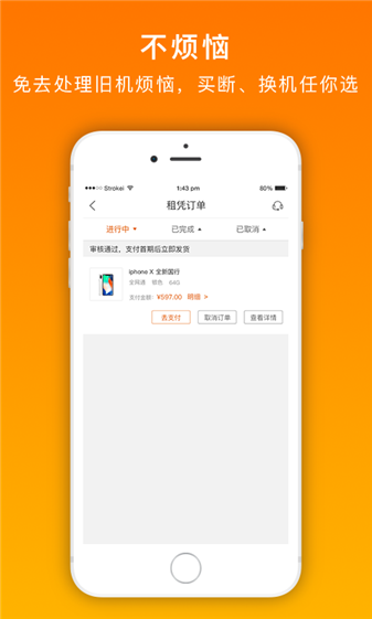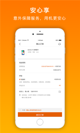 【零元押金】随心享与芝麻信用战略合作,推出信用租机服务。只要您芝麻信用分数高于600分,分分钟就能零押金把手机带回家!【超低门槛】每月只需少量租金,动动手指即可拥有设备,年年换新机再也不是梦!