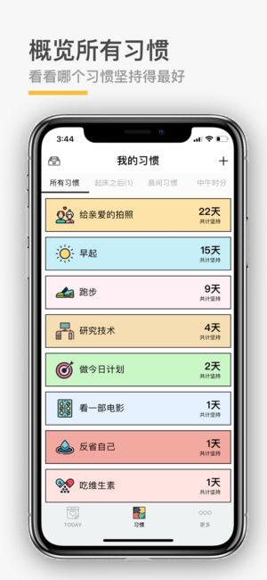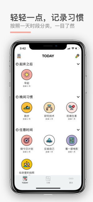 1.可以为每个习惯设置在一周内的哪几天重复,哪个时间段执行;2.今天要坚持的习惯会单独呈现在 TODAY 页面中,轻轻一点图片即表示完成该习惯的打卡;