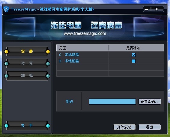 到这里大家注意一下..安装程序默认会勾选C盘进入保护模式的..我们把它取消了.然后不要设置密码.勾选保护取消后.我们点击开始安装