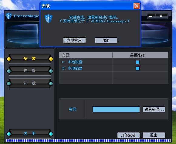 到这里大家注意一下.. 安装程序默认会勾选C盘进入保护模式的..我们把它取消了.然后不要设置密码.勾选保护取消后.我们点击开始安装。安装好了,我们点击重启。