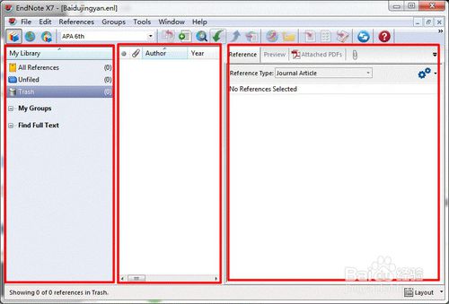 创建完成个人专题数据库后界面如下,工作区从左到右依次是分组窗口,文献显示窗口和文献预览和检索窗口