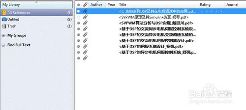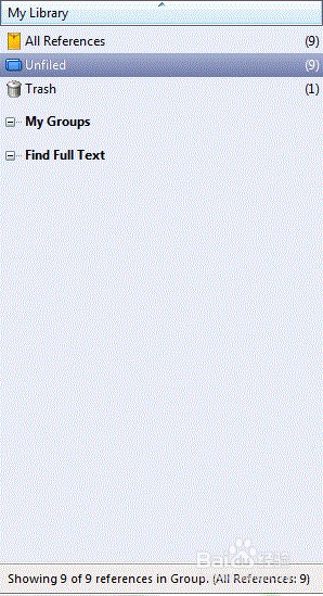 最左边是分组窗口,默认情况下从上而下依次是:全部文献、未分组文献、已删除文献、分组文献、在线自动查找全文的文献,这些从前面的图标可以很容易理解;添加的文献会根据其类别出现在不同分组里,很显然任何文献都会出现在全部文献组;而且分组类别是可以自定义的;