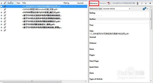 最右面是文献预览和检索窗口,在文档显示窗口选择文献就会在Reference显示文献所有的具体信息,Preview是预览信息,然后是文献的PDF查看,如下图: