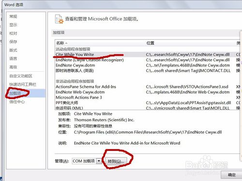 跳转页面,在左侧工具栏选择“加载项”,在框内找到“Cite While You Write”,选中该选项,然后点击下方的“转到”按钮