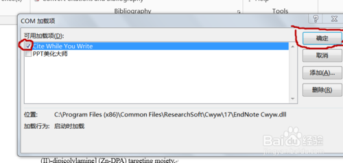 页面跳转,在“Cite While You Write”条目的左侧小方块内打上"√",再单击右侧的”确定“按钮,
