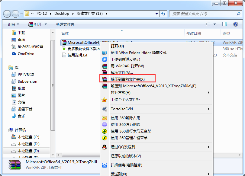 本站仅对原软件包“依样”打包,未做过任何改动,但不保证所提供软件或程序的完整性和安全性。1、下载本站Microsoft Office 2013(64位)免费完整版安装包,之后右键选择“解压”(没有解压选项的需安装解压缩工具)。