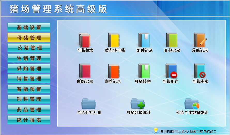 一、基础信息:栋舍设置、购销单位设置、品种设置、管理人员、仔猪保健免疫设置、母猪保健免疫设置二、母猪管理:母猪档案、后备转母猪、配种记录、母猪分娩记录、转栏登记、小猪寄养登记、种猪销售登记、种猪存栏情况、种猪死亡登记