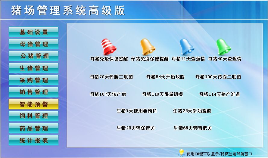 七、智能预警:母猪21天查返情、母猪40天查返情、母猪70天传腹二联苗、母猪84天开始攻胎、母猪100天传腹二联苗、母猪107天转产房等