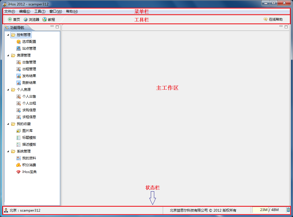 菜单栏:默认包含五个菜单:文件、编辑、工具、窗口、帮助。当打开站点管理和房源管理时,还会动态显示和当前主工作区相关联的功能菜单。