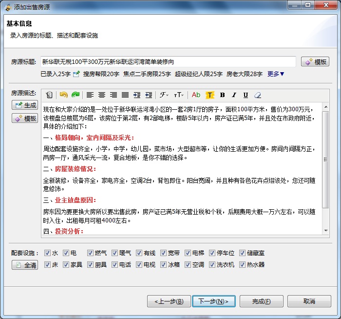 4.填写标题和描述,选择配套设施,然后点击“下一步”,进入如下界面: