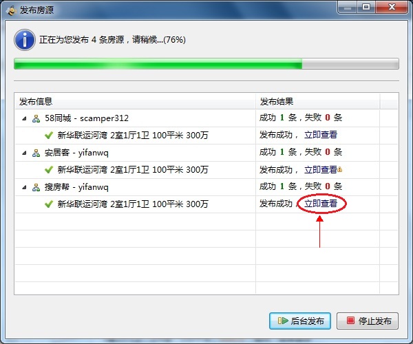 3.房源发布时,系统自动打开发布进度窗口,如下图: