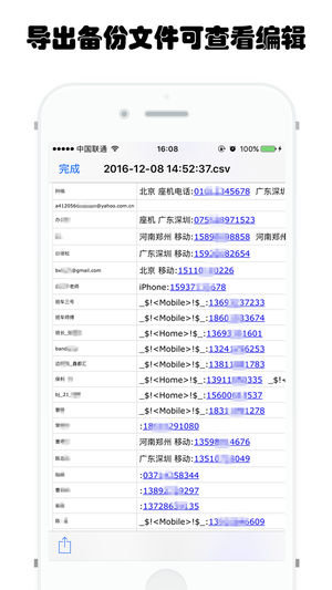 1、备份&导出&编辑为Excel(CSV)或者网页(htm)或者PDF文件通讯录中的联系人,可以直接备份并导出未CSV或者htm文件。CSV文件可以直接被Excel打开浏览,htm文件可以直接被IE、SafARi、chrome等浏览器浏览器。CSV文和htm文件可以通过邮件直接发送备份。