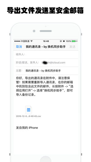 1、备份通讯录,安全第一!2、不再上传到云服务器,直接导出为文件,发送至您的安全信箱,并可下载到本地阅读编辑!