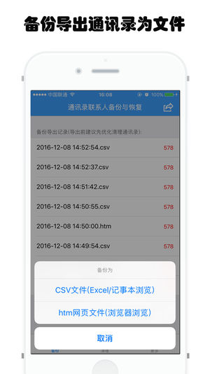通讯录中的联系人,可以直接备份并导出未CSV或者htm文件。CSV文件可以直接被Excel打开浏览,htm文件可以直接被IE、SafARi、chrome等浏览器浏览器。CSV文和htm文件可以通过邮件直接发送备份。