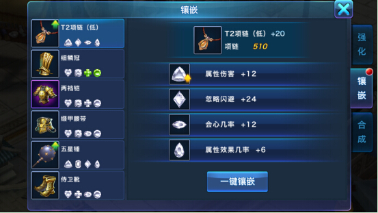 而装备镶嵌宝石可为装备增加额外的属性,玩家可以跟进宝石带来的属性镶嵌到不同的装备,宝石等级越高提供的属性值越高。宝石可通过珍宝阁购买