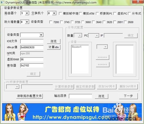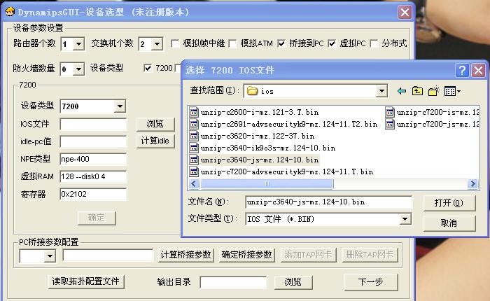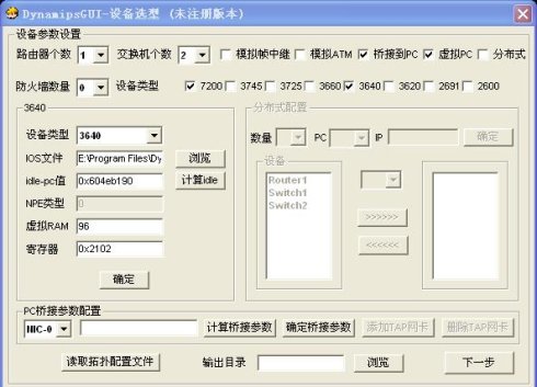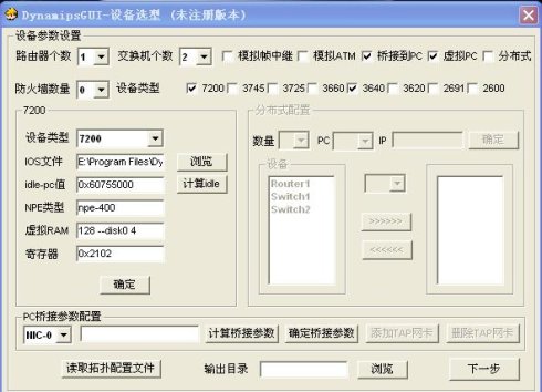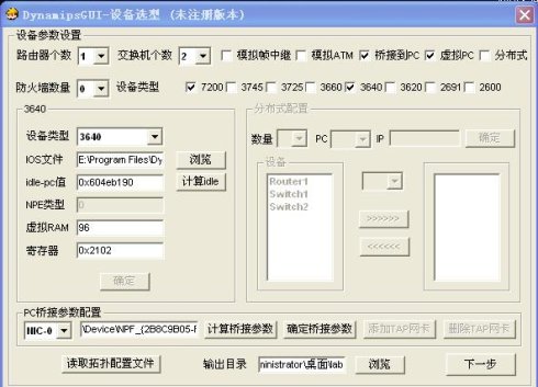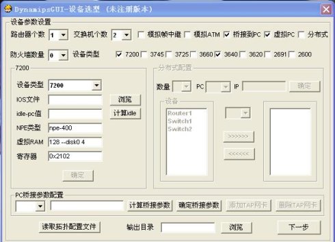 1、首先做设备选型,R1使用Cisco的7200路由器,SW1、SW2用Cisco的3640路由器来模拟,路由器个数填1,交换机个数填2,勾选桥接到pc和虚拟pc。