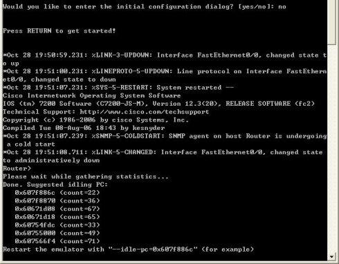 可以先随便选择一个idle-pc值,并记下上面所有的16进制值。(在一切配置完后,生成.bat文件后再去修改这个idle-pc值。修改idle-pc值后启动设备,打开任务管理器看CPU的占用情况,关掉设备重新修改idle-pc值,只到CPU的占用率让你满意为止。)