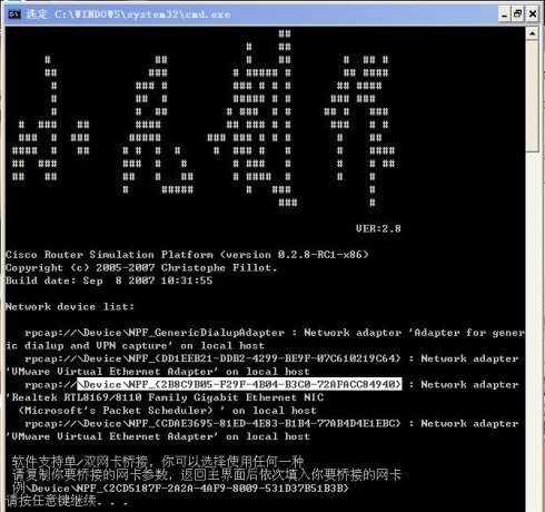 3.请确认按照正确步骤正确安装了WinPcap并获取了非无线设备的网卡参数,请确认您获取参数的网卡在使用dynamips时没有被禁用