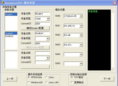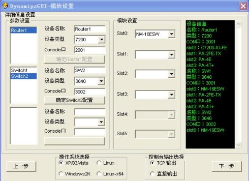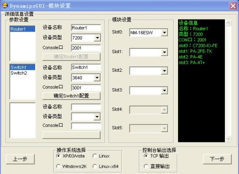 点击Router1,设备名称自己填,设备类型7200,端口号2001,完成后在telnet到此设备时用。模块设置,在不同的插槽中按需插入模块。然后点击确定Router1配置。