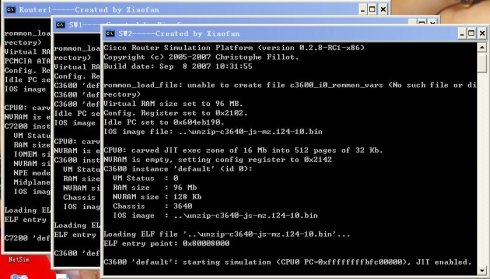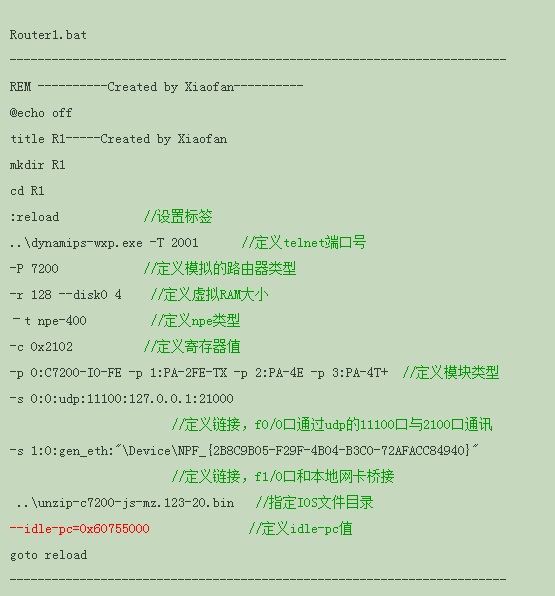 11、点击Router1.bat启动Router1,同样点击相应的.bat文件可以启动Switch1、Switch2。如果你没有设置好idle-pc值,在这里可以通过修改.bat文件修改idle-pc值(根据你在上面记下的一组16进制值来修改idle-pc值,修改后启动设备,打开任务管理器看CPU的占用情况,关掉设备重新修改idle-pc值,只到CPU的占用率让你满意为止。)。