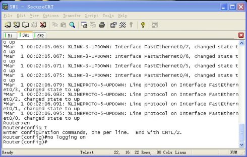 12、用SecureCRT telnet到Router1,当然也可也用windows自带的cmd。