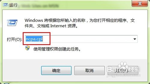 在Win 7“开始”中打开“运行”对话框,在其中输入“ncpa.cpl”如下图红框所示,再点击“确定”按钮。