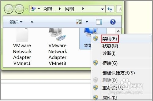 在“本地连接”图标上点击右键,在出现的菜单中选择“禁用”选项,如下图红框中所示。