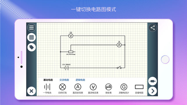 物理实验课苹果版是一款专门为中小学物理课程所打造的学习辅助软件,在物理实验课中,用户可以随心所欲的设计电路图以及做一些与电路相关的小实验,这样能够帮助用户加深对电路知识的理解。