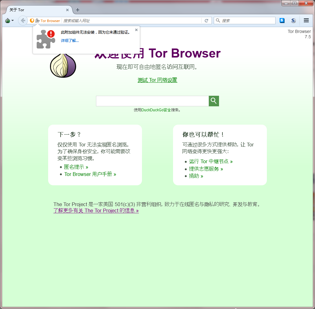 首先我们要将下载好的后缀为“.xpi”的文件直接拖入到洋葱浏览器窗口中,然后浏览器右上角便会警告“此附加组件无法安装,因为他未通过验证。”