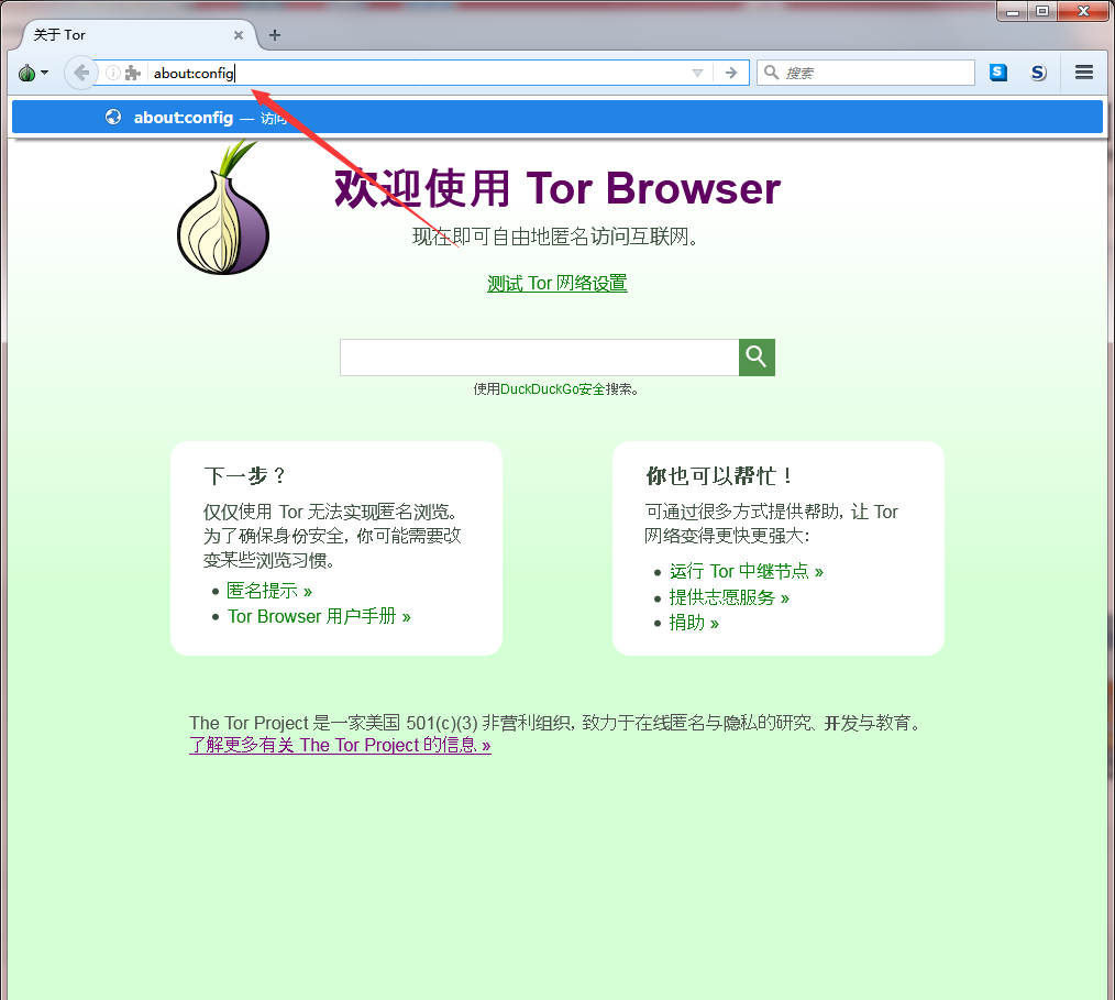 此时我们应保持冷静!冷静!我们在地址栏输入“about:config”然后回车进入洋葱浏览器的高级设置选项,然后什么都不用管,直接冲着我们的目的去点击“我了解此风险!”即可进入下一步!