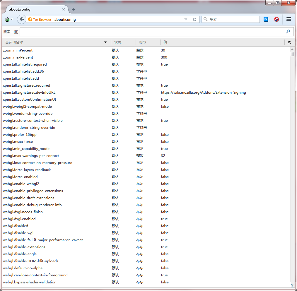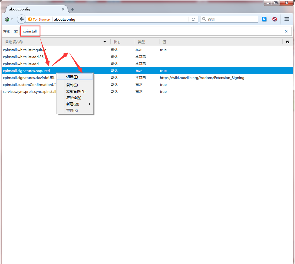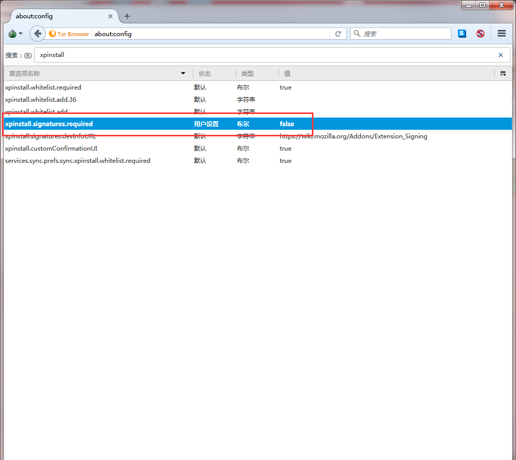 进入后的界面是这样的,然后我们在搜索框内边输入“xpinstall”,找到和图片上一样的那一列(考虑到某些人的存在,我还是说一下吧是哪一类列,“xpinstall.signatures.required”),然后我们在这个列上面单机鼠标调出右键菜单选择菜单中的第一项"切换(T)",操作完以下步骤后可见这一列上的文字变成了粗体,即操作完成!