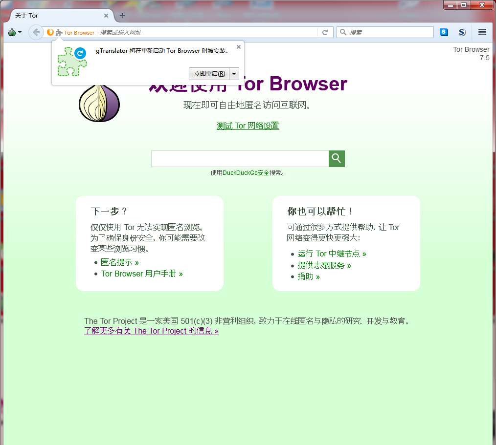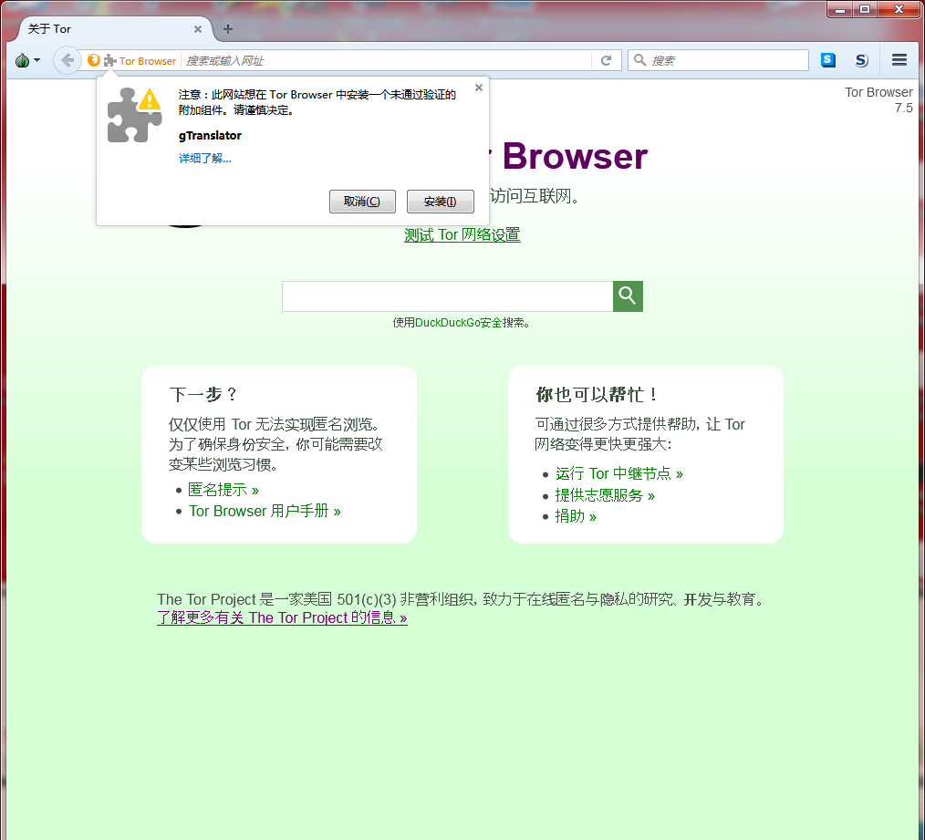 然后我们就可以重新安装“tor-bro-plug.xpi”这个扩展了,直接把该扩展拖入洋葱浏览器窗体内,然后我们就看到成功安装并提示重启后生效,到了这边安装步几乎骤接近尾声!