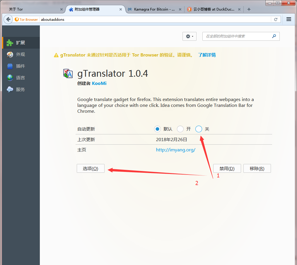 重启浏览器以后该扩展便成功安装了,但我们这边还要操作两个小小的步骤,我们点击右上角的三个横杠 - 附加组件即可看见该扩展已成功安装,现在我们需要点击更多信息对该扩展进行管理,首先我们要把自动更新这边给关闭了,我们点击“关”,再点击选项(O),将”不显示该翻译按钮到页面右键菜单中。“选项前面的勾勾去掉,第一个去不去掉无所谓。