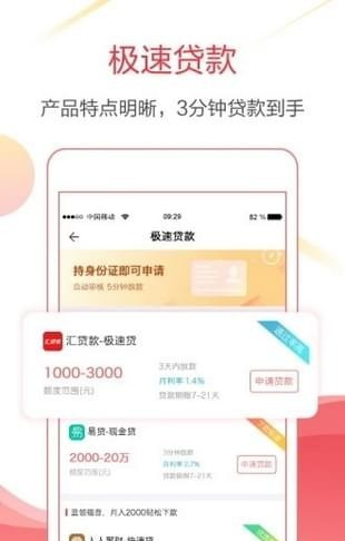 1、精准推荐:无论上班族、个体户,均可匹配到合适的现金贷产品2、极速放款:3分钟快速申请,审核通过极速放款