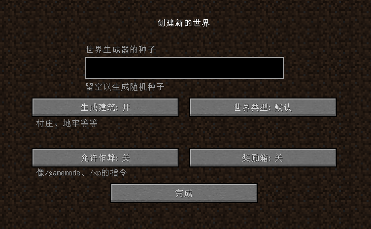 在选择创建一个新的世界之后,会随机生成一段代码,之后所有世界内地形的生成都会基于这段代码,而这段代码就是种子(Seed)。Beta1.3版之后,作者在地图创建时增加了自定义种子代码的输入框,使我们能通过输入特定种子代码来生成特定的世界环境,见下图:
